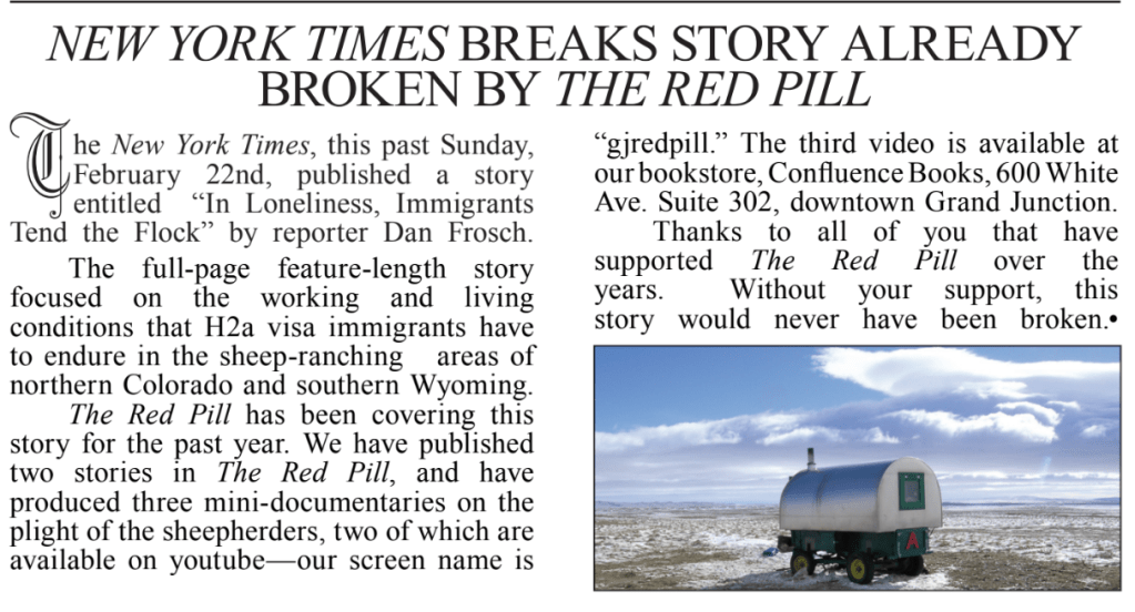 We broke stories. The biggest was broken by Jake Carpenter, and then professor Tom Acker and their work to document labor and human rights abuses of H2A visa immigrant sheep herders. Carpenter would go on to publish three short documentaries on the subject, numerous articles for the Red Pill, and an award winning article in The Denver Voice, Acker and Carpenter also led other, larger media outlets out there to see for themselves.