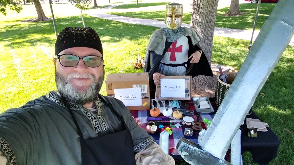 At Sherwood Park, a new game adds to the lazy noon buzz on most Saturdays. New players meet a merchant selling leather pouches and potions of healing. An armored knight and an elf argue about how to best rob an oncoming caravan while two ladies in medieval dresses spar with foam swords. Yet past all the costumes and props, a few cardboard boxes are stacked bearing the label, “Mutual Aid.”