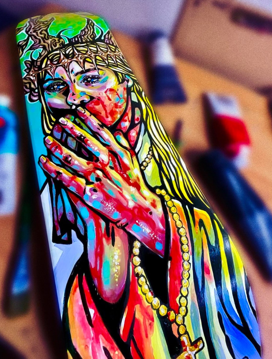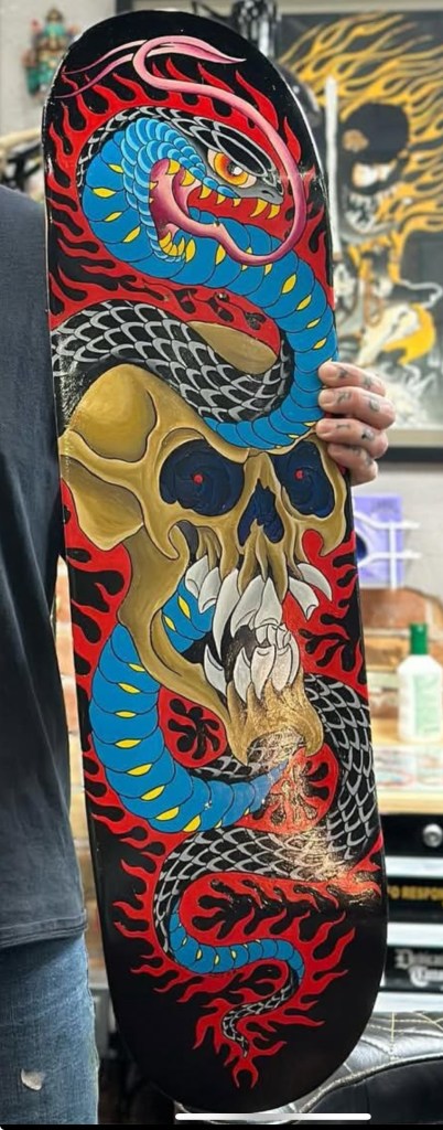 TP: Skateboarding, punk rock, tattooing. It all goes hand in hand. I think the decks pay homage to the places we spent our time during our formative years that ultimately led to the birth of the Lowbrow Classic and even First Street Tattoo Parlor—basement shows, skateparks, criminal mischief, graffiti, touring with our bands, etc. Personally, they invoke feelings of youth and freedom, and it adds a lot of depth to the art they play host to.