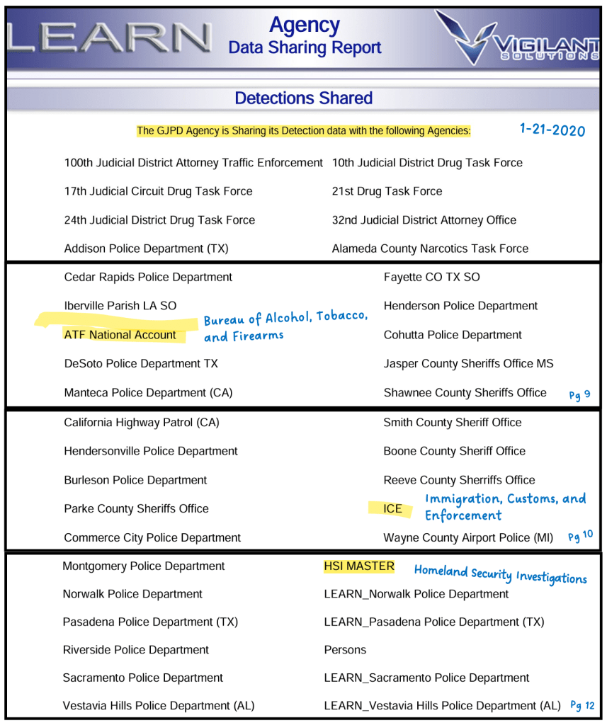 Additionally, in 2019, GJPD cameras were sharing data with immigration enforcement. Documents from Vigilant Solutions (now Motorola Solutions) show that GJPD cameras were sharing data with over 500 outside agencies, including “ATF National account”, ICE, and HSI.