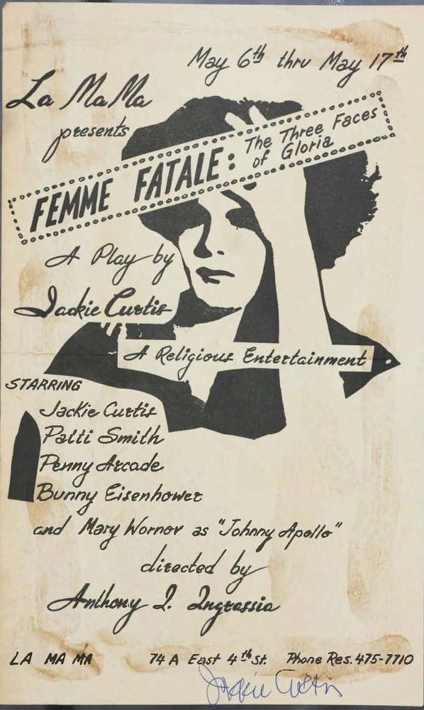 Arcade was featured in Jackie Curtis’s own theatre production, Femme Fatale: The Three Faces of Gloria (1970) along with punk icons, Patti Smith & Jayne County.