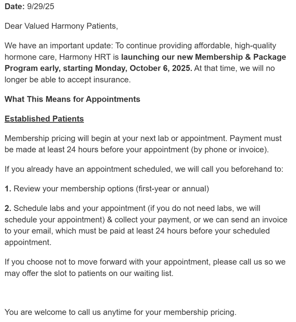 In a move that had been communicated to patients to take place January 1, as of October 6, Harmony HRT in Fruita will no longer be taking insurance of any kind.