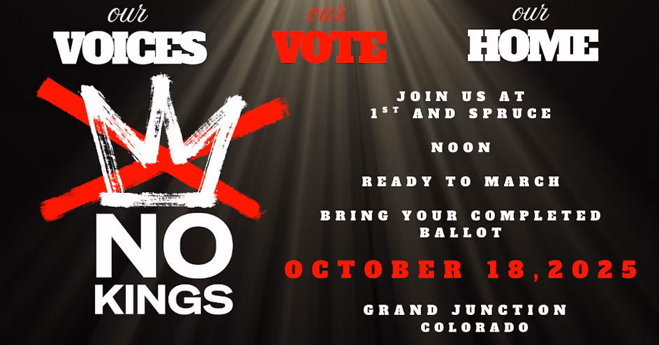 GRAND JUNCTION, CO — October 9, 2025 — In the days leading up to the No Kings 2.0 March on Friday, October 18, Indivisible Grand Junction and community partners will host a series of events to encourage civic engagement, voter participation, and public awareness around issues of democracy, education, and accountability.