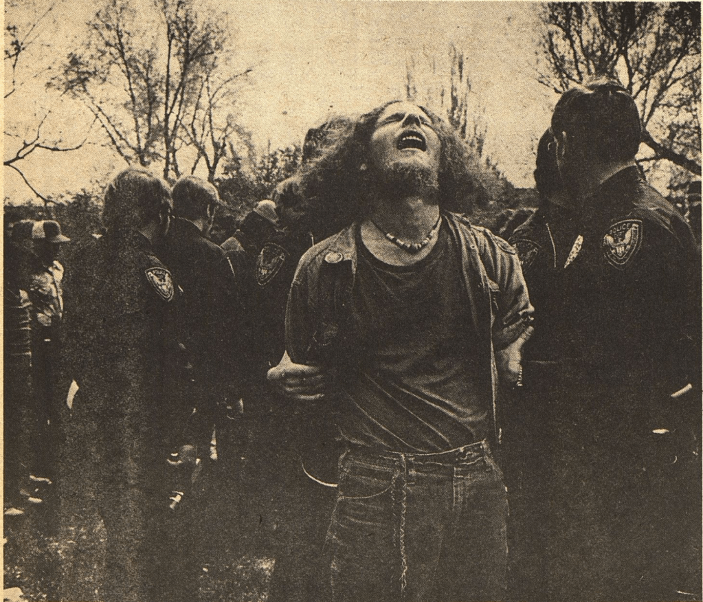 “We assumed the local police would stand around the outside of the crowd and pick people off, but that’s not what they did. They walked INTO the crowd,” said Lance. “Me being Yippie I followed them, [the cops] walked over to this poor little college kid, and [the cop] goes ‘this one’ and when they grabbed him, So I grabbed him, and bear-hugged his legs… and I wouldn’t let him go.”