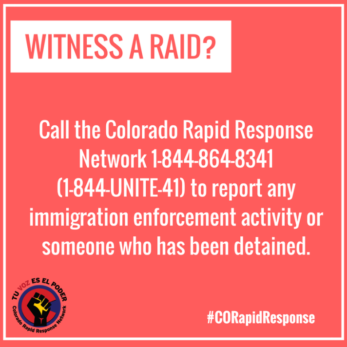 Report ICE activity in Colorado to the Colorado Rapid Response Network at 1-844-864-8341.