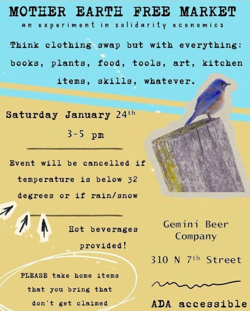 Quinn Miller: All credit for the idea and the poster art goes to Dana Guber and the crew at Rubble Art Collective, a creator space and used art supply store in Fort Collins (@rubbleartcollective on IG). Dana has been organizing the Mother Earth Free Market for a few years now, and I thought it would be a good idea to bring it here to Grand Junction. A big thank you to Gemini Beer Company for giving us a space to host this event.