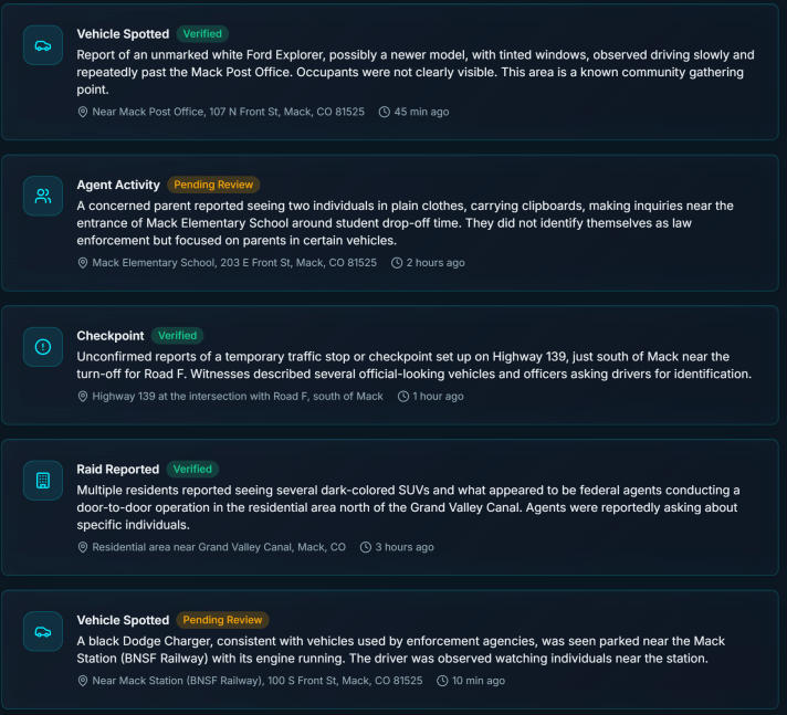En los últimos dos días, dos personas han enviado a The Revolutionist capturas de pantalla de “informes” locales sobre la actividad del ICE procedentes de un sitio web que se hace pasar por una herramienta comunitaria para rastrear al ICE en nuestras comunidades.