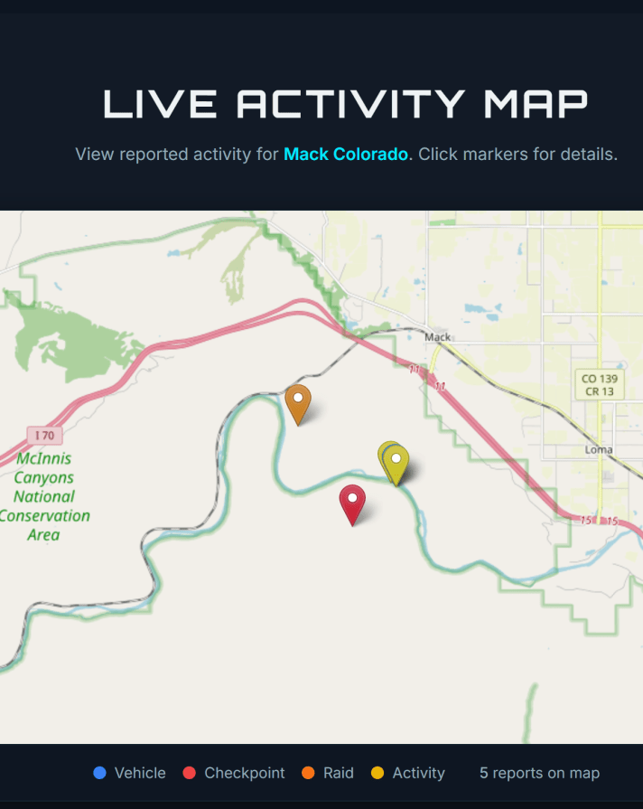 El mapa que genera el sitio web muestra toda la actividad de ICE en Mack, Colorado, como si tuviera lugar en el Área Nacional de Conservación McInnis Canyons.