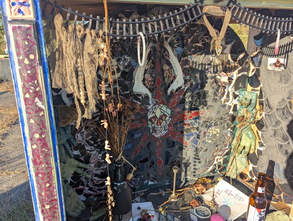 Just up the embankment between the fire and the abandoned building complex is an area with physical memorials that travelers have built over time. There is an entire mini cathedral made with metal, stone, and stained glass. There is a mini Airstream trailer someone made, surrounded by pictures and candles and things people have left. Some of the names on the memorials are ones I hear by the fire. There’s an old rotary phone on a wooden box labeled “wind phone,” that says “give your dead friend a call.”