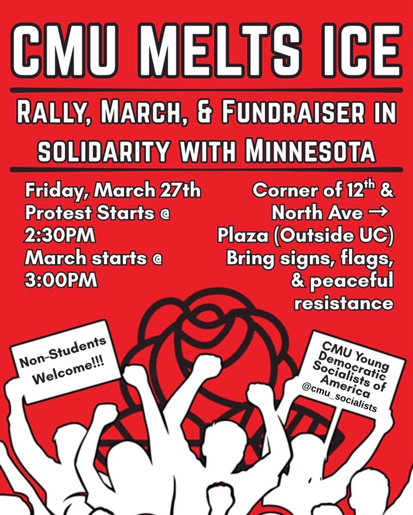 Over spring break, the CMU chapter of the Young Democratic Socialists of America was suspended in an attempt to cancel our upcoming rally, march, and fundraiser. This event is a peaceful protest, meant to display solidarity and raise funds for families in need. Our leadership had every intention to notify CMU about this event, but we did not ask permission. Why? Because we have the right to march and protest on campus! We also do not need assistance with the event, as we have experienced protest organizers, safety marshals, and do not need to rent a room or equipment. We are also unwilling to wait for any bureaucratic holdups, as the club advisory board will often deny event requests, drag things out for weeks, require clubs to pay unreasonably high fees, hire poorly trained staff/security, and/or leave reserved rooms locked. The families we are fundraising for need this money as soon as possible, especially with rent due in less than a week.