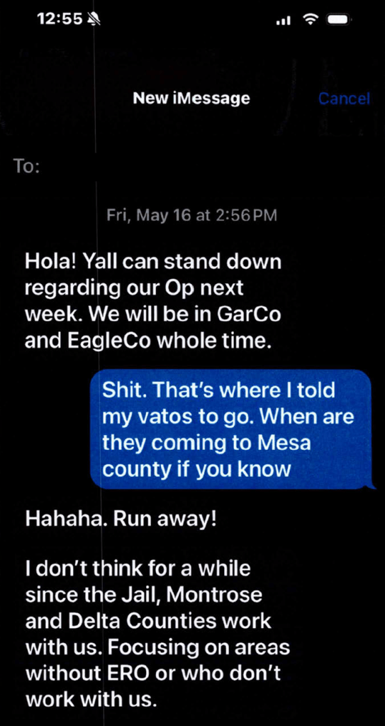 Also concerning was a text message thread between HSI acting agent in charge Eric Selfridge and MCSO Lieutenant Holdren. In the final message, Selfridge explains why ICE was canceling a planned operation in Mesa County and indicates that from ICE and HSI’s point of view “the [Mesa County] Jail, Montrose and Delta counties work with us,” allowing the feds to “[focus] on areas without ERO or who don’t work with us.”