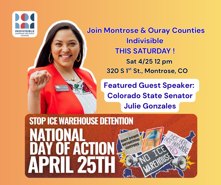 Montrose, Colorado — On Saturday, April 25 Montrose and Ouray Counties Indivisible will hold an action at 320 South 1st Street, Montrose, to denounce immigration detention expansion for the Communities Not Cages National Day of Action to Stop ICE Warehouse Detention. Currently, ICE is scouting, purchasing, and retrofitting warehouses nationwide for immigration detention, which are expected to detain between 1,500–10,000 people each. ICE is currently considering reopening a 200,000 square foot, closed prison just four hours from Montrose in Walsenburg, Colorado, proposing to house over 100,000 humans. Jailing people in large-scale, makeshift detention warehouses will exponentially increase the likelihood of abuse and death in ICE custody, which is tragically already at an all-time high under the Trump administration. Detention warehouses will also divert critical resources such as water and electricity away from local communities, could cut off tax revenue, foreclose economic opportunities and destroy local landscapes.